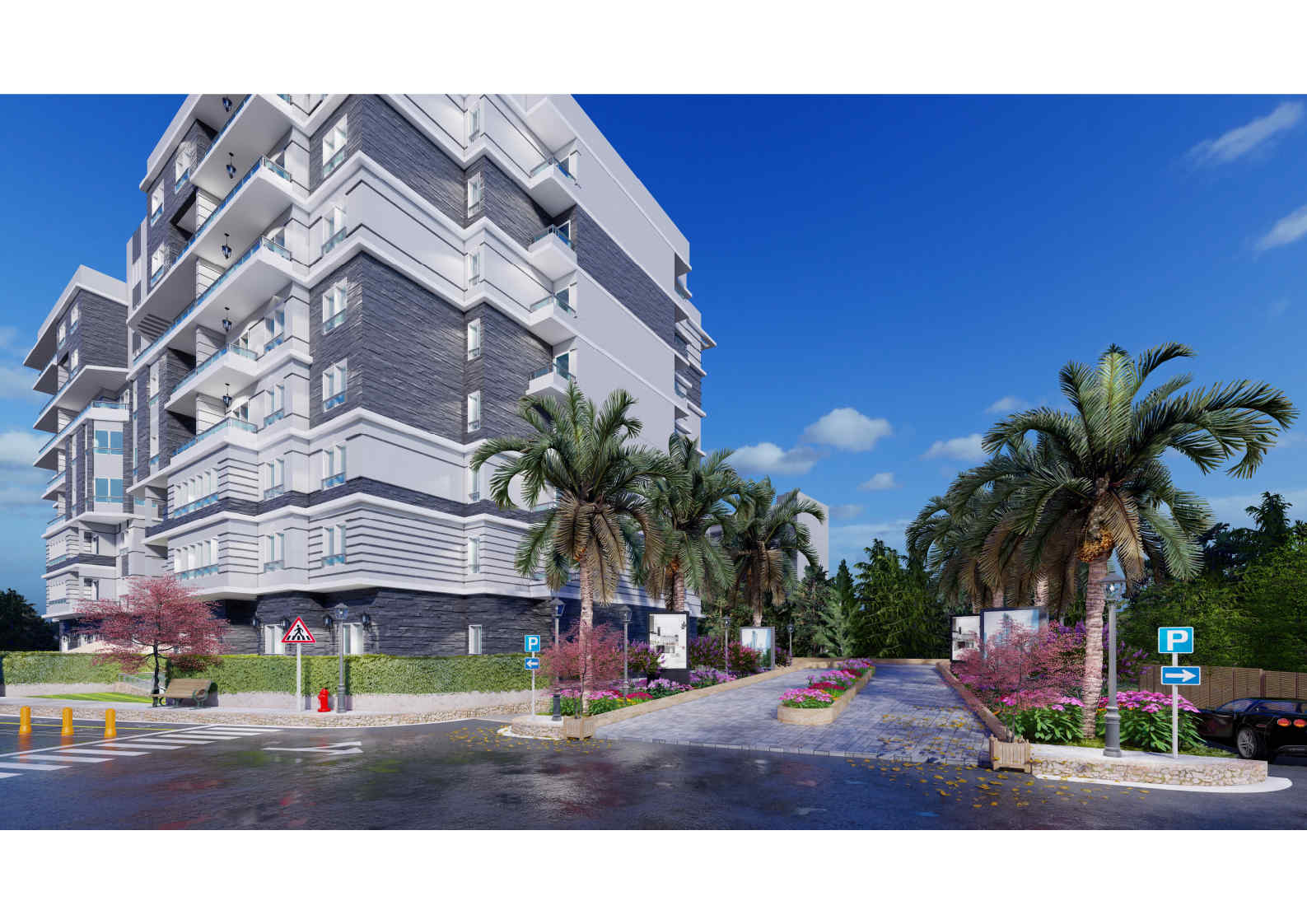 تصميم اللاندسكيب بعناية ليشمل حدائق ومساحات خضراء للاسترخاء.